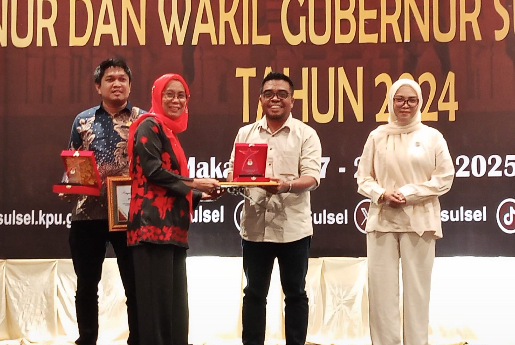 Penghargaan tersebut diserahkan langsung oleh Anggota KPU Sulawesi Selatan, Upi Hastati, kepada Ketua KPU Sinjai, Muh. Rusmin, dalam acara Rapat Koordinasi Evaluasi Tahapan Pemilihan Gubernur dan Wakil Gubernur Sulawesi Selatan Tahun 2024 yang digelar di Hotel Claro Makassar, Senin (28/4).