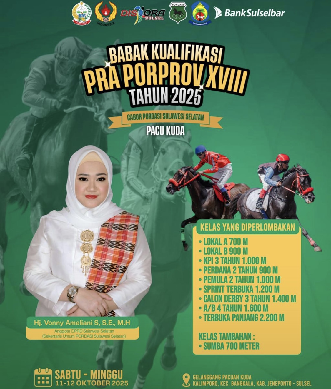 Kegiatan ini dijadwalkan berlangsung Sabtu hingga Minggu, 11–12 Oktober 2025, di Galangan Pacuan Kuda Kalimporo, Kecamatan Bangkala, Kabupaten Jeneponto.