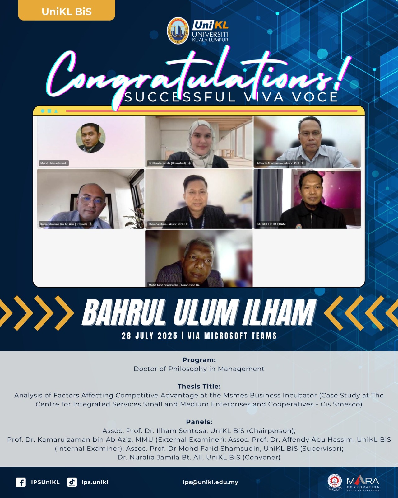 Sidang tersebut menjadi penanda puncak dari perjalanan akademik Bahrul selama menempuh pendidikan doktoral di bidang Manajemen di UniKL Business School Malaysia.