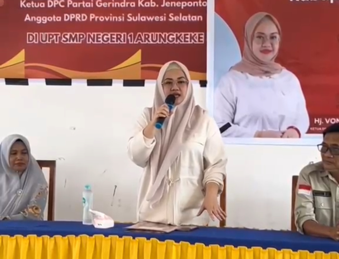 SULSELPEDIA – Ketua DPC Gerindra Kabupaten Jeneponto, Vonny Ameliani, menyerahkan secara simbolis Beasiswa Program Indonesia Pintar (PIP) kepada 122 siswa SMP Negeri 1 Arungkeke, Jumat (29/8/2025).
